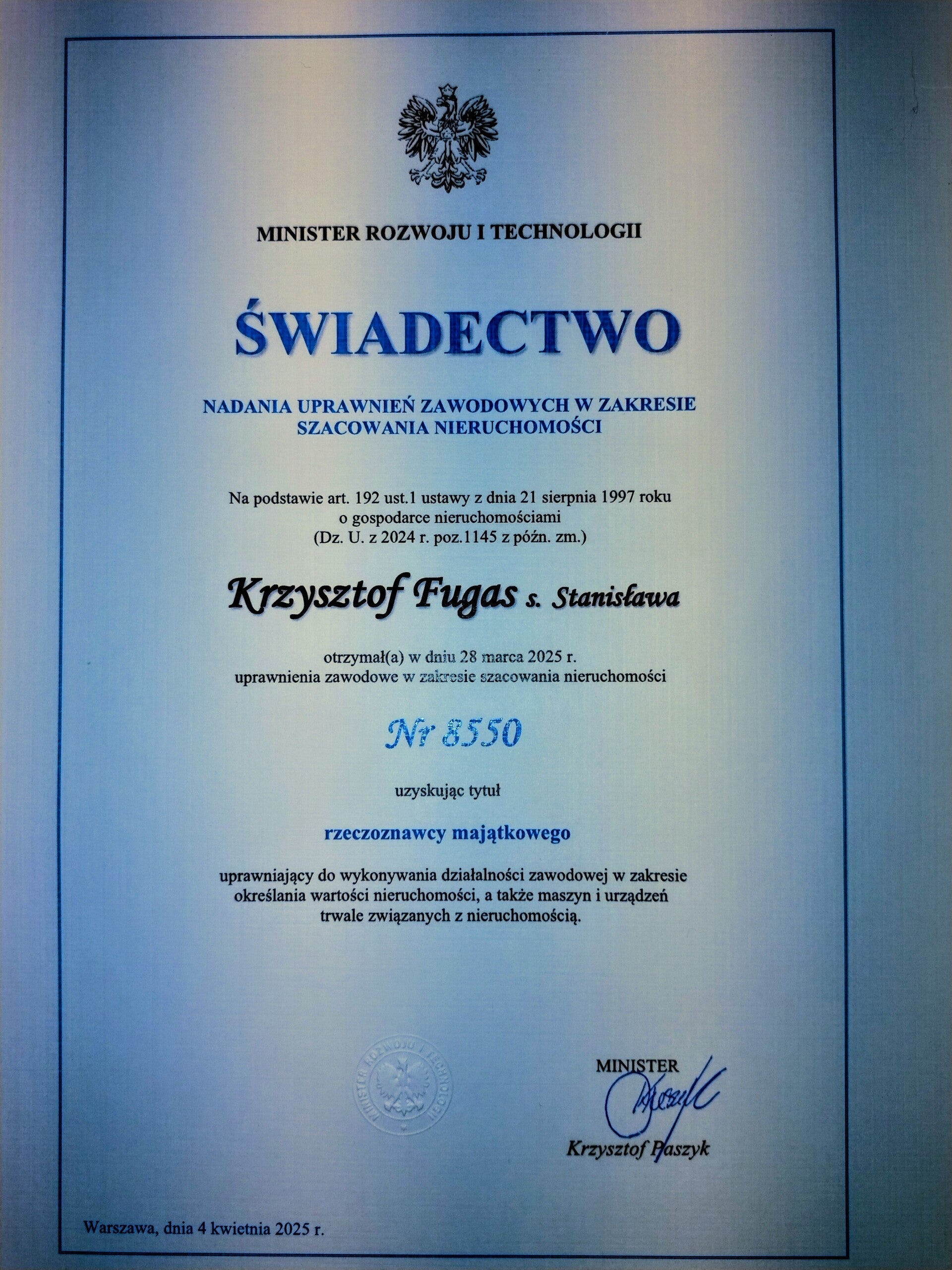Uprawnienia zawodowe nr 8550 (wpis do Centralnego Rejestru Rzeczoznawców Majątkowych ) w zakresie szacowania nieruchomości oraz maszyn i urządzeń trwale związanych z nieruchomością, nadane przez Ministra Rozwoju i Technologii.